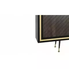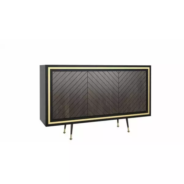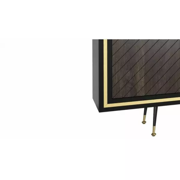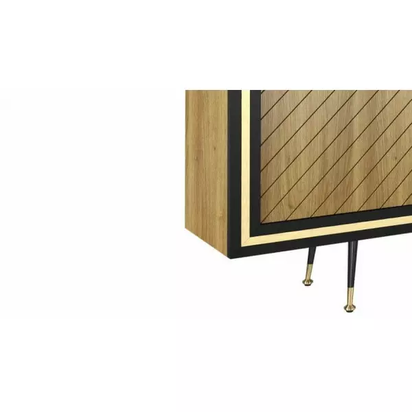 Komoda Elegance to ekskluzywny mebel w awangardowej odsłonie. Okazałości dodają komodzie nietuzinkowe fronty z motywem jodełki oprawionym w czarną ramkę ze złotym lub srebrnym dekorem. Zachwycają smukłe nóżki nadające lekkości i fantazji. Współczesne wzornictwo oparte na ciekawej formie pozwala czerpać z tego co najlepsze pod względem funkcjonalnego użytkowania i estetyki. Elementy kolekcji Elegance to wytworność, perfekcja wykonania i najlepszej jakości materiały. Komoda jest też niezwykle praktyczna, wysokie nóżki ułatwiają odkurzanie, zwłaszcza za pomocą robota. Mebel może być wybarwiony w dwóch kolorach: dąb naturalny lub onyx. Za drzwiami znajduje się półka z możliwością regulacji wysokości. Drzwi są bez uchwytów, otwierane za pomocą systemu push-to-open.