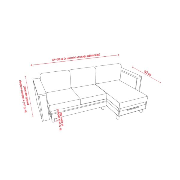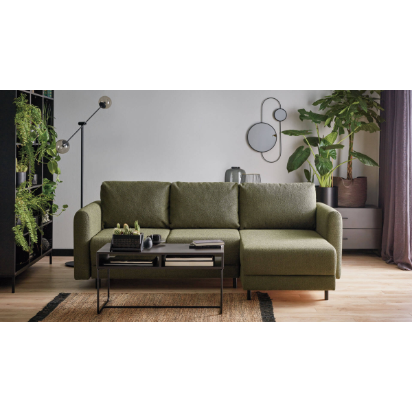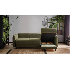 Komfortowy i kompaktowy narożnik z funkcją spania. Dzięki dwóm wariantom nóżek możesz dopasować go do swojego wnętrza, a dwa praktyczne pojemniki do przechowywania sprawią, że twój salon będzie jeszcze bardziej funkcjonalny.