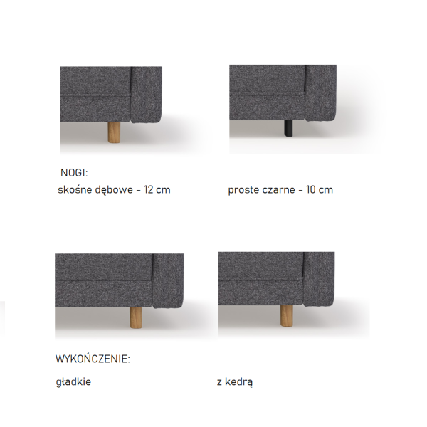 - Do wyboru są dwa rodzaje nóżek: skośne dębowe (wysokość 12 cm) oraz proste drewniane czarne (wysokość 10 cm), które nadają narożnikowi lekkości wizualnej i ułatwiają utrzymanie porządku pod meblem.