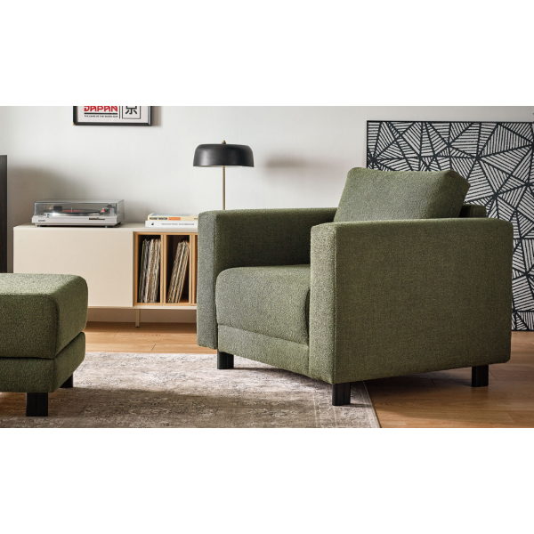 - Dzięki wysokim nóżkom fotel jest optycznie lekki. Do wyboru są nieco wyższe, skośne nóżki w kolorze naturalnego dębu oraz proste czarne nóżki, niższe i smuklejsze. W efekcie fotel może mieć różną wysokość, co przełoży się na jego funkcjonalność.