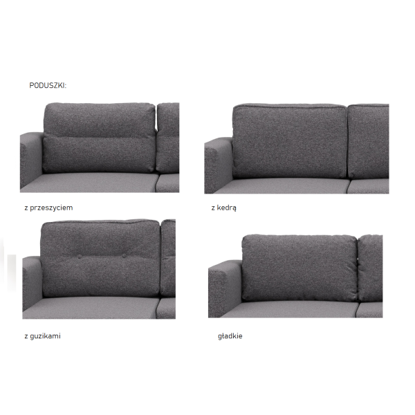 - Styl fotela można zmienić, wybierając inną poduszkę oparciową. Sugerowaną poduszkę z kedrą można zastąpić poduszką gładką, z guzikami lub z dekoracyjnym przeszyciem. Mają one inną wysokość i komfort użytkowania. Wybierając dany wariant w karcie produktu, można sprawdzić, jak zmieni się wygląd mebla.